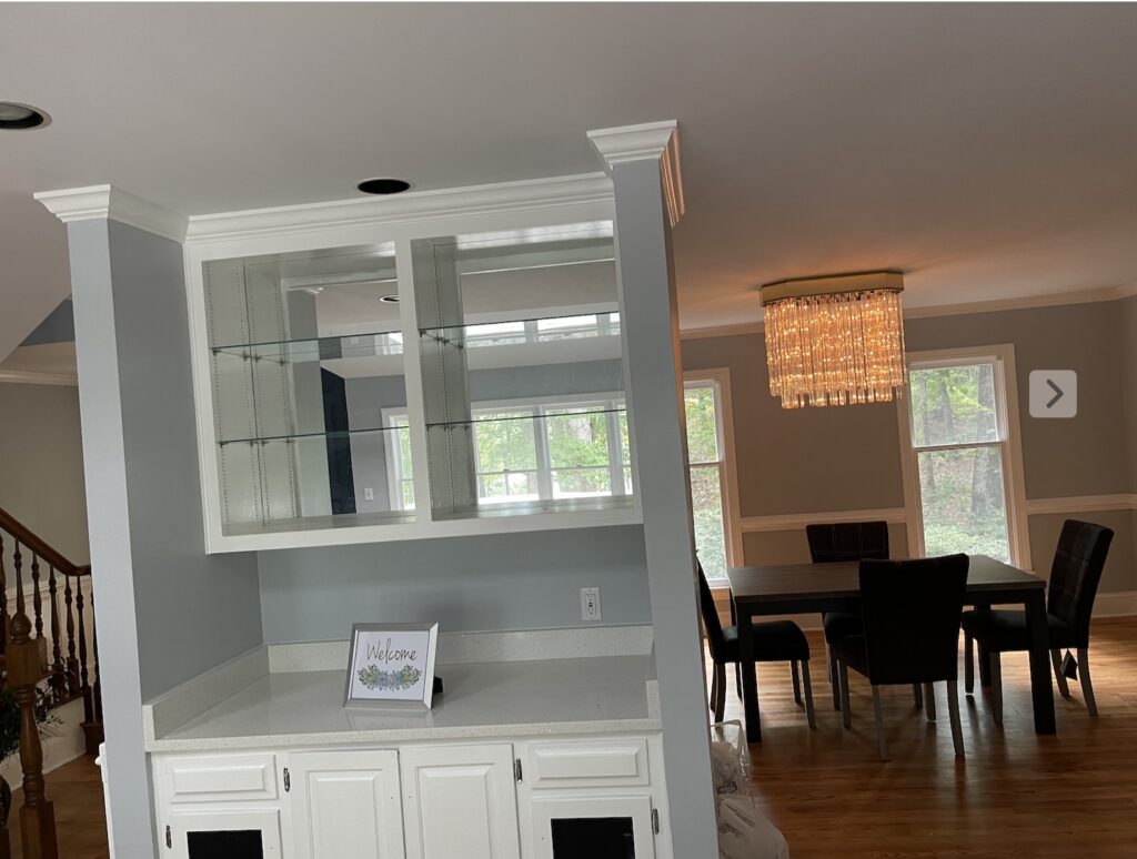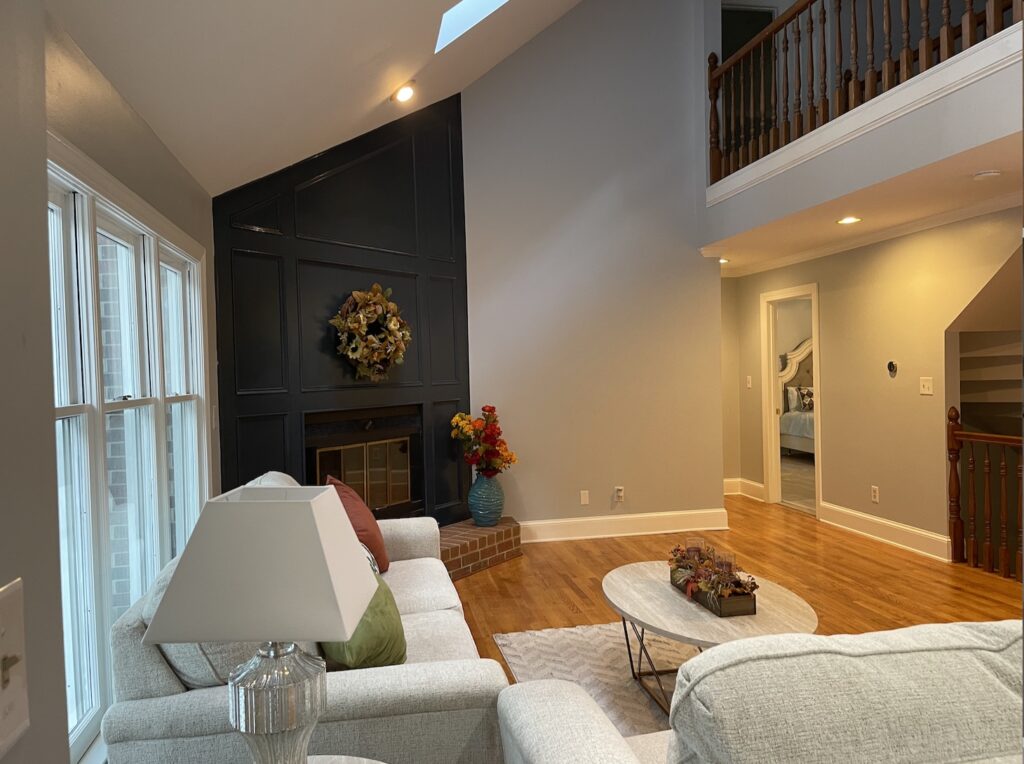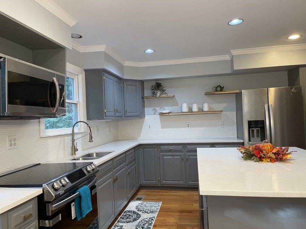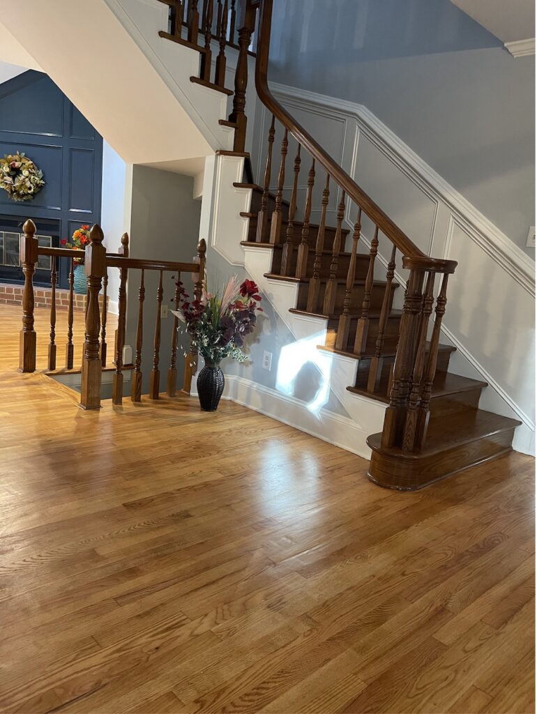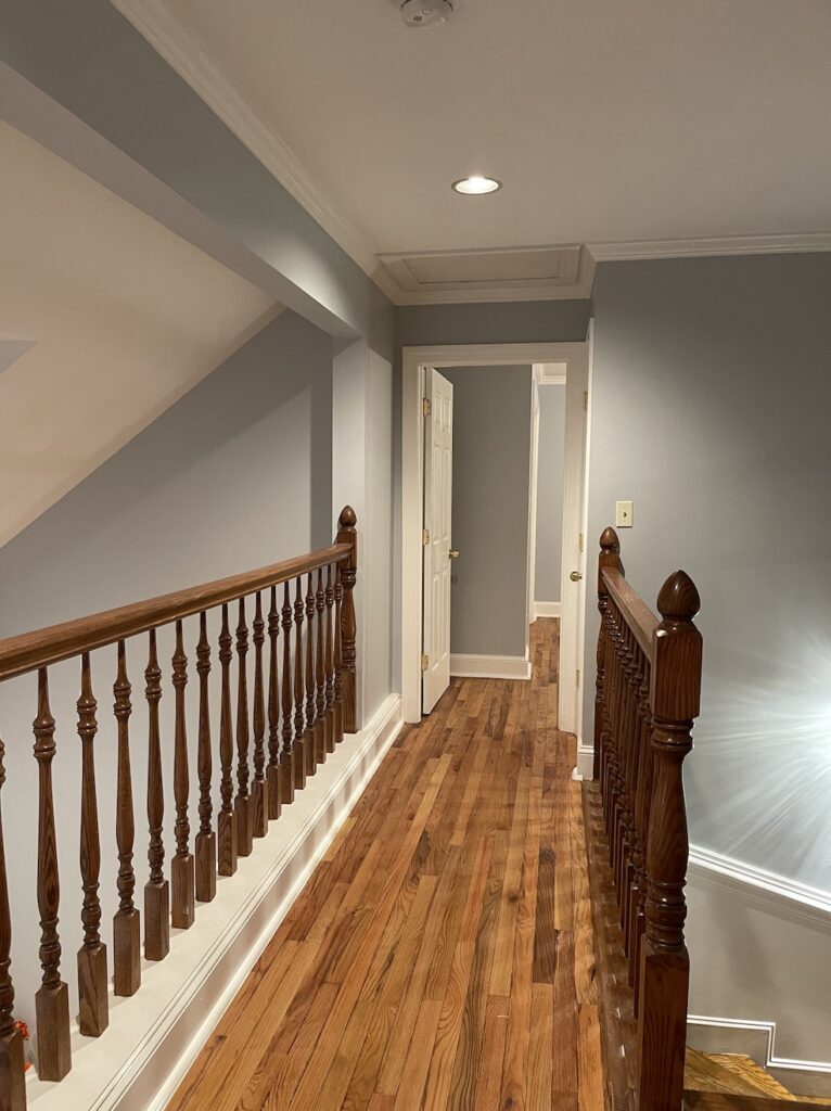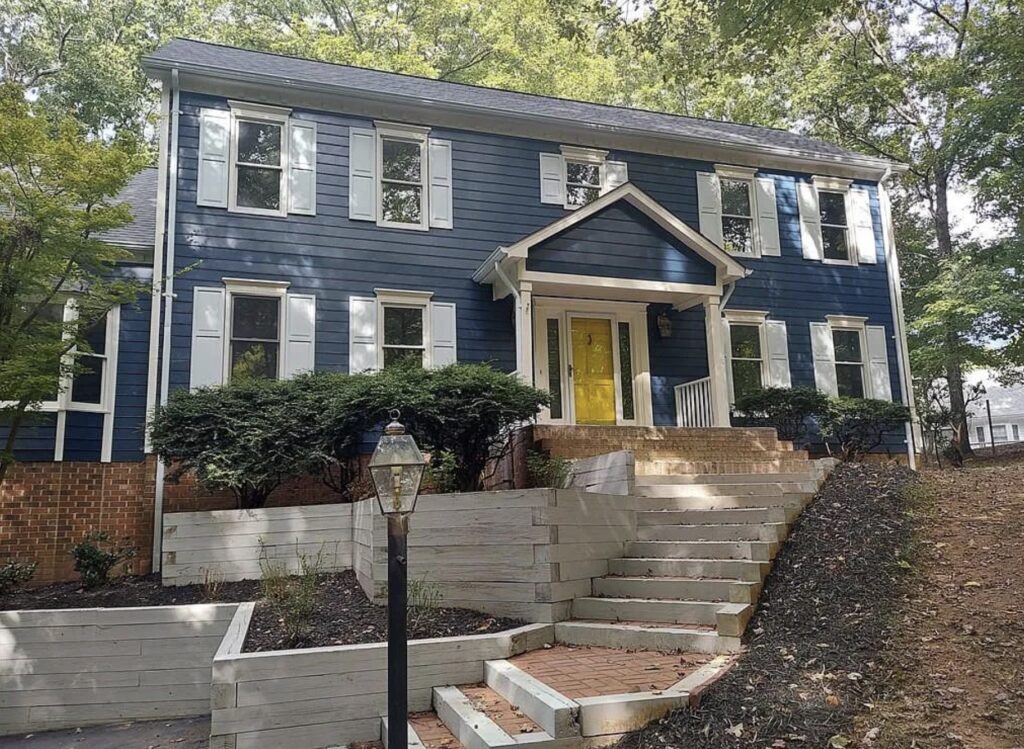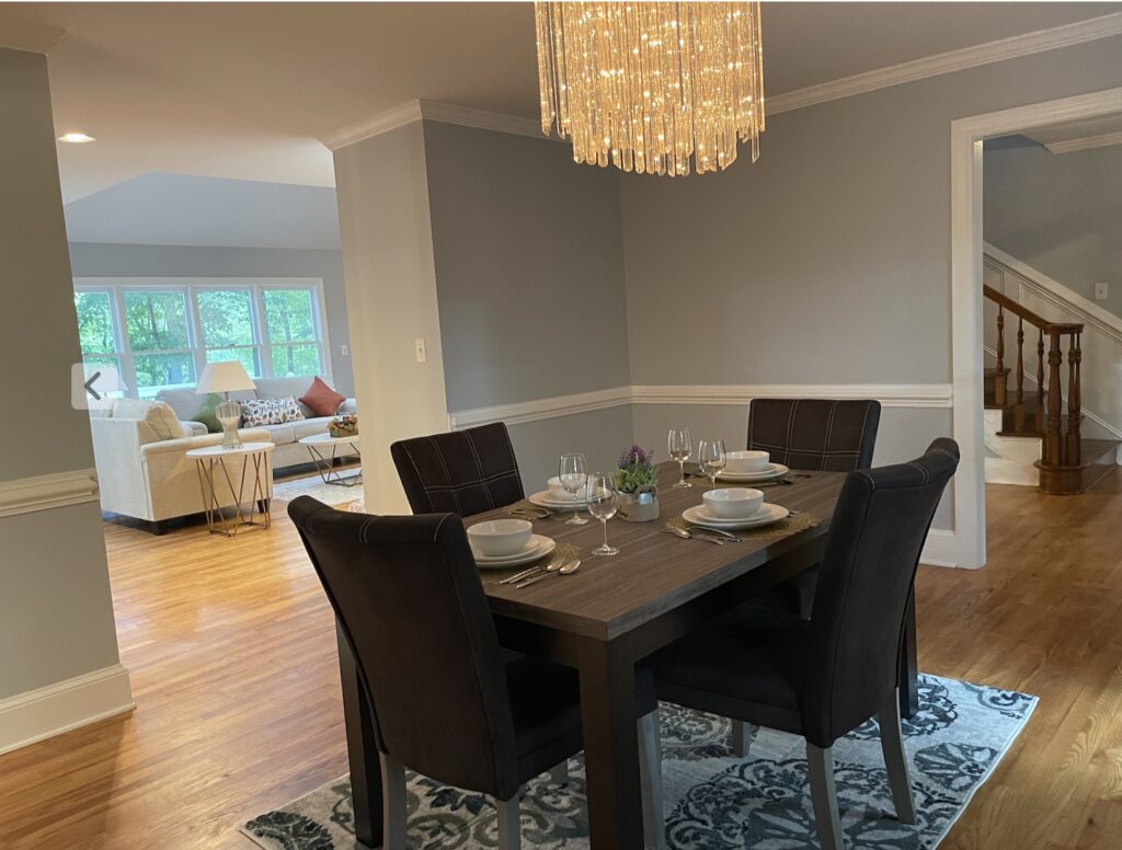 This project was a three-story house with 4 bedrooms, 3 and a half bathrooms, living room, dining room, kitchen, breakfast nook, laundry room, and finished basement, consists of repairing the siding, refinishing hardwood floors, tiling master bathroom floors, installing laminate floors in the master bedroom, installing kitchen backsplash, countertops, and painting kitchen cabinets, interior/exterior painting, and landscaping,