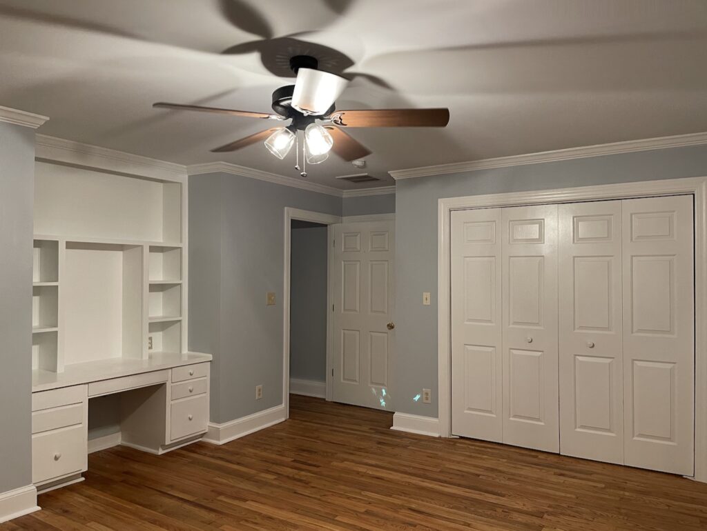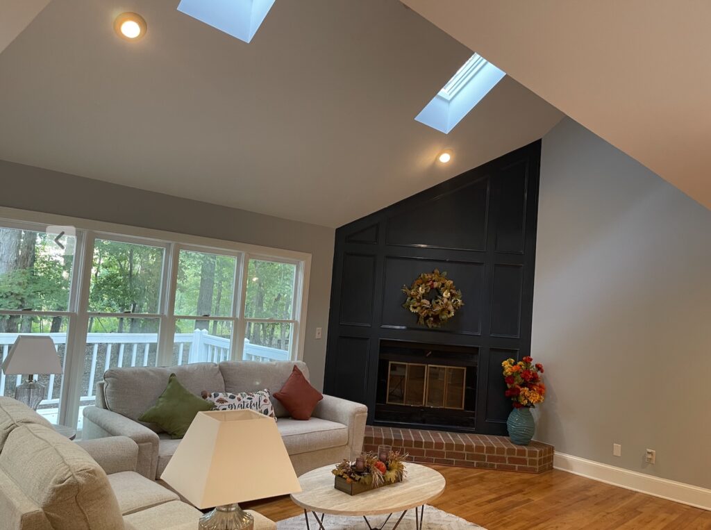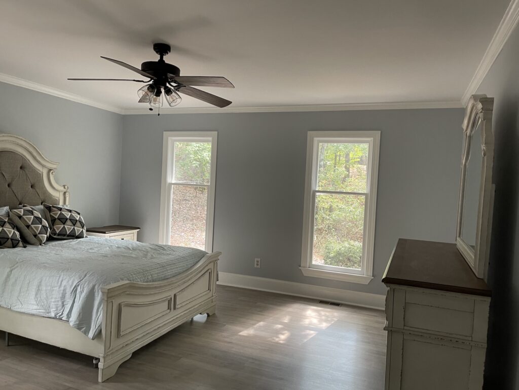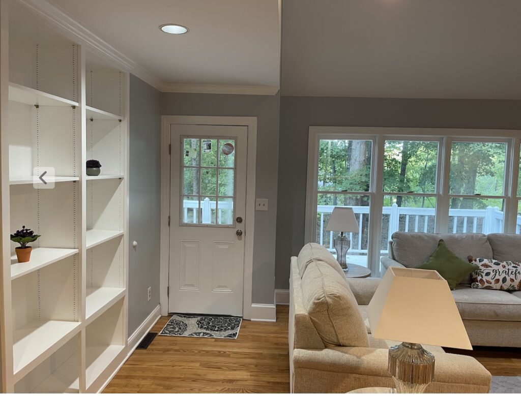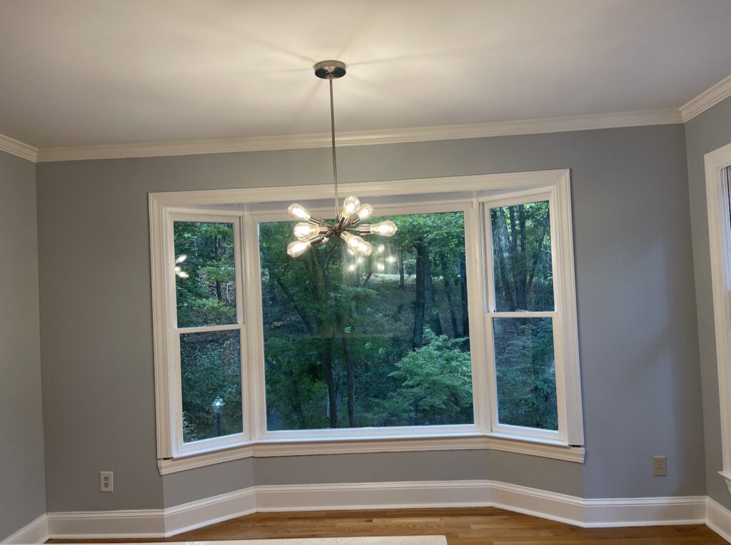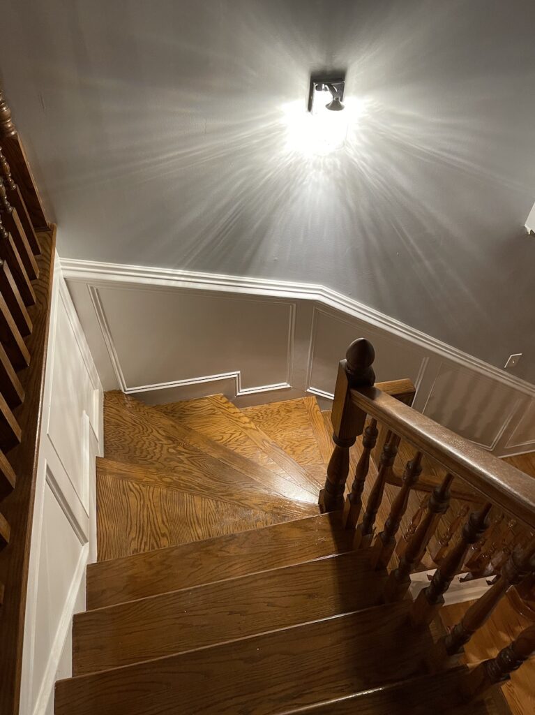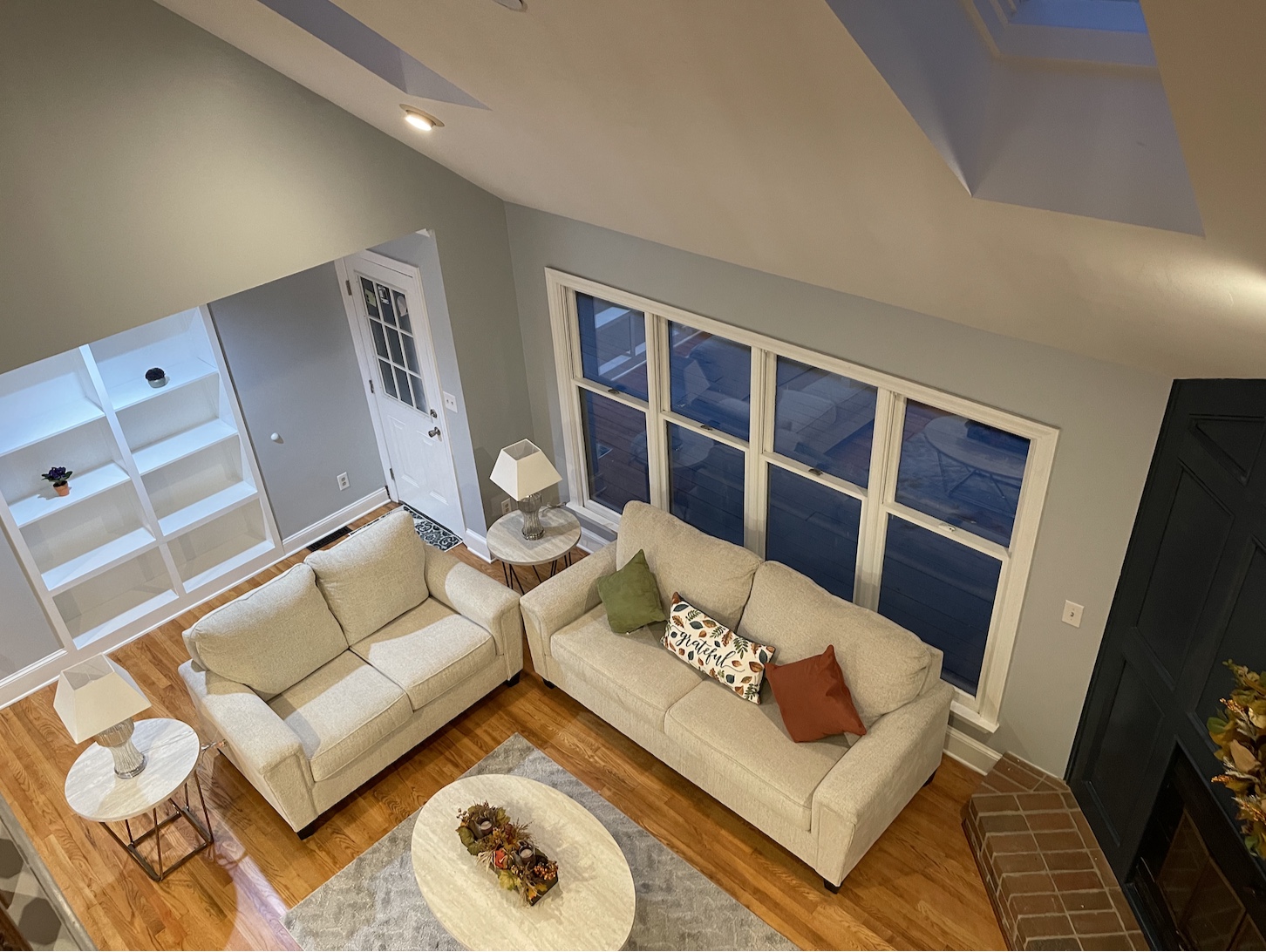This project was a three-story house with 4 bedrooms, 3 and a half bathrooms, living room, dining room, kitchen, breakfast nook, laundry room, and finished basement, consists of repairing the siding, refinishing hardwood floors, tiling master bathroom floors, installing laminate floors in the master bedroom, installing kitchen backsplash, countertops, and painting kitchen cabinets, interior/exterior painting, and landscaping,